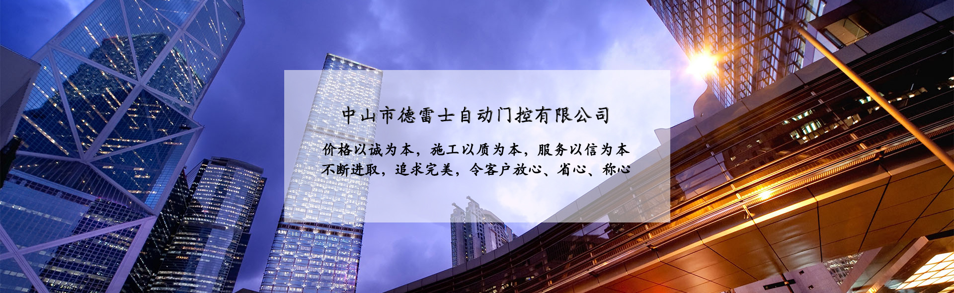 中山市德雷士自動門控有限公司代理中山松下自動門、中山松下感應(yīng)門、及其旗下品牌松下(Panasonic)自動門、旋轉(zhuǎn)門、型材門、松下門禁系統(tǒng)、地彈簧、閉門器等系列產(chǎn)品。 松下Panasonic一直致力于憑借不斷創(chuàng)新的技術(shù)營造為各個區(qū)域的用戶做出最佳解決方案,在自身領(lǐng)域處于領(lǐng)先地位;松下自動門控系統(tǒng)廣泛應(yīng)用于寫字樓、機關(guān)單位、大型企業(yè)、學(xué)校、醫(yī)院、智能小區(qū)等領(lǐng)域。在用戶心中有良好的口碑及信譽度。 松下(Panasonic)自動門控系統(tǒng)包含:自動感應(yīng)門、旋轉(zhuǎn)門、90度平開門、圓弧型門、重疊門、緊急逃生門、醫(yī)用門、氣密門、鋁合金型材門、松下門禁系統(tǒng)、家庭智能鎖、地彈簧、閉門器等系列產(chǎn)品。 德雷士自動門控有限公司從事智能門控十余載,精英匯聚;公司具有完善的管理體系,對每位客戶都進行檔案管理,跟蹤服務(wù),定期回訪,終生維修。提供急修12小時解決,一般維修48小時解決的服務(wù),完全能解決您的后顧之憂。 公司的質(zhì)量方針 科學(xué)管理確保的工程質(zhì)量 真誠服務(wù)贏得客戶信譽 持續(xù)創(chuàng)新打造企業(yè) 公司的服務(wù)宗旨 價格以誠為本,施工以質(zhì)為本,服務(wù)以信為本。 實實在在做人,老老實實做事,以我們的辛苦換來客戶滿意的微笑,這就是我們的追求! 公司的目標 ...